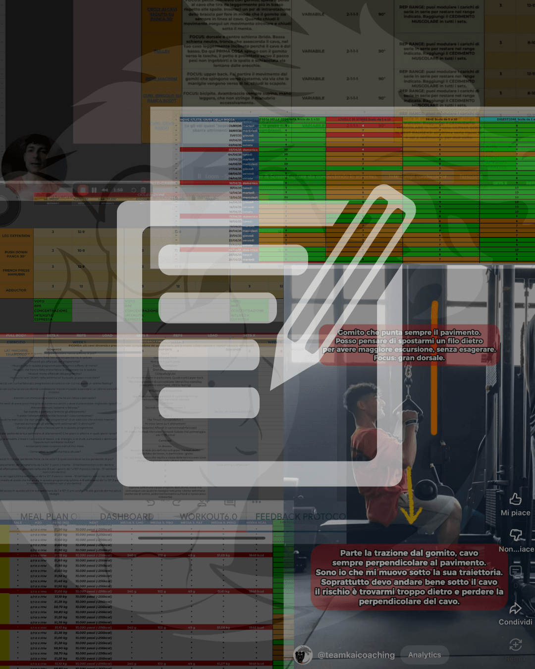 GESTIONE TECNICA: video correzioni/analisi delle esecuzioni, video dimostrativi su come svolgere ogni esercizio, perché svolgerli in quel modo con aggiunta di tips avanzate, descrizione input motori e movimenti.